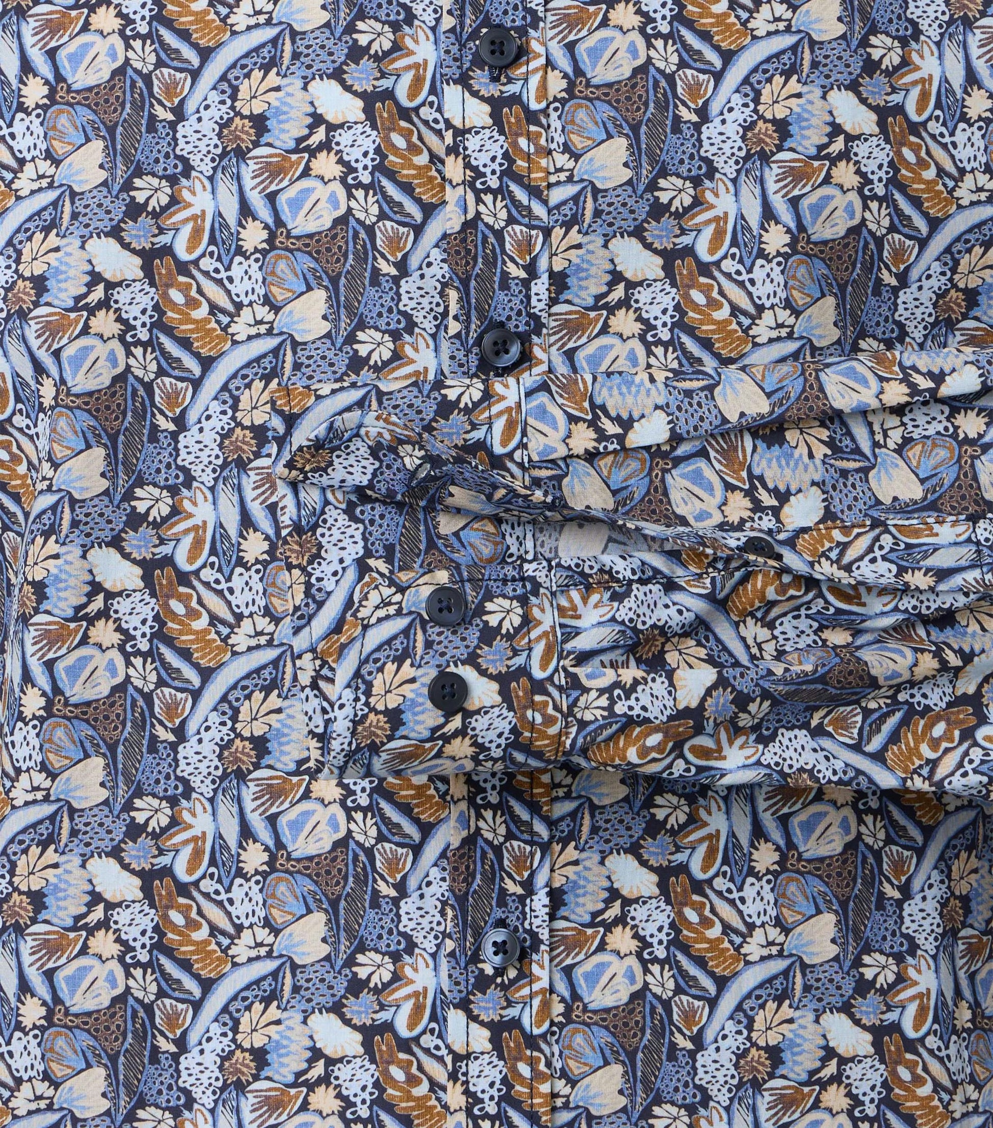 Dit casual overhemd maakt indruk met zijn normale pasvorm, puur katoen en de aangenaam zachte textuur van de poplinstof, die dankzij de subtiele glans een bijzonder hoogwaardige uitstraling heeft. De bloemenprint over de hele stof zorgt voor subtiele accenten en maakt het overhemd veelzijdig voor vrijetijdsactiviteiten, informele bijeenkomsten of familiefeesten. Dankzij de klassieke button-down kraag is het overhemd gemakkelijk te combineren met een T-shirt, bermuda, jeans of een trui. De afwezigheid van een borstzak zorgt voor een strakke, minimalistische look. Hoogwaardige afwerking maakt het ontwerp compleet.