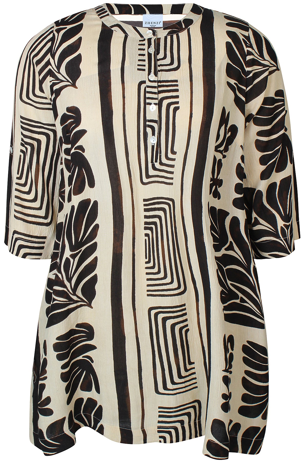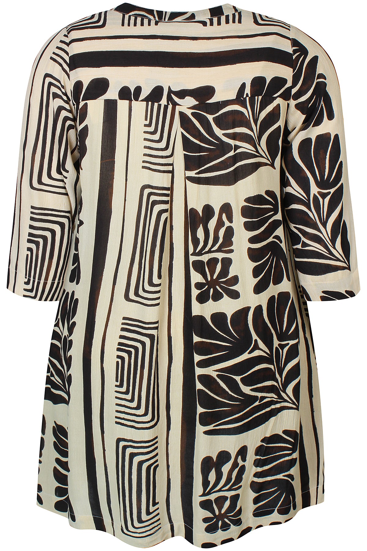 Ronde hals die sluit door middel van knopen. De tuniek heeft driekwart mouwen en een bijzondere print.