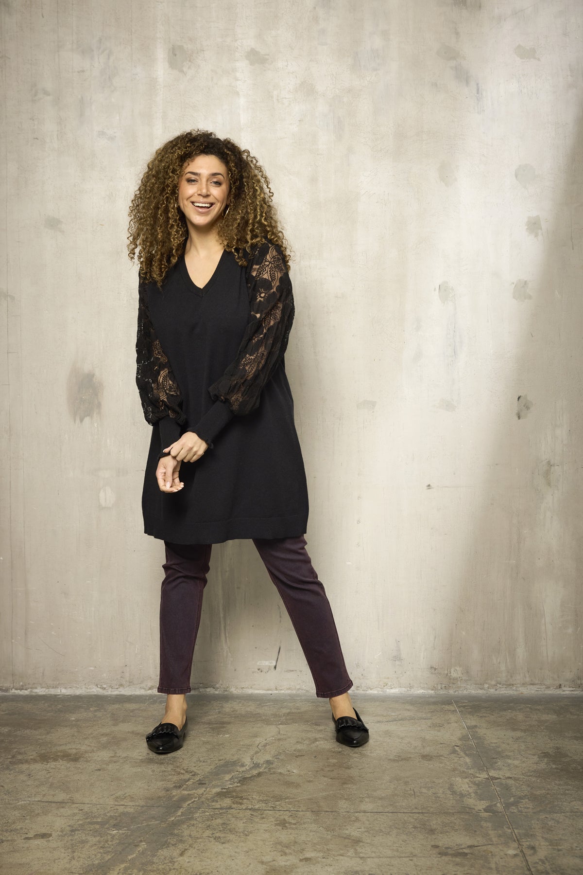Tuniek met kanten mouwen. De stof is dikker zodat deze tuniek perfect te dragen is met koudere dagen.